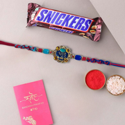 Elegant Blue "Bhai" Rakhi With Snickers Peanut Filled Chocolate Bar, 20 g
