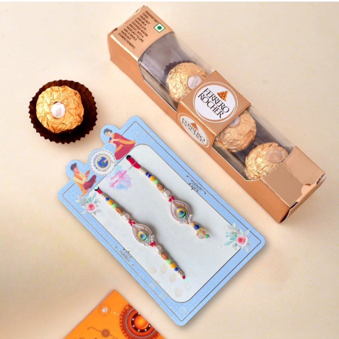 Peacock Bond Rakhi with Ferrero Rocher Chocolate Gift Pack (4 pieces) , 50 g